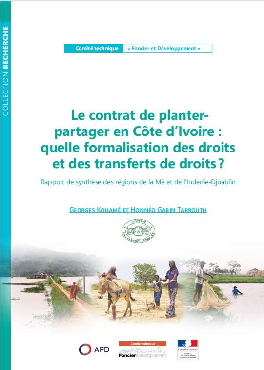 Dans les campagnes ivoiriennes, les rapports socio-fonciers sont structurés autour de divers arrangements institutionnels marchands et non marchands d’accès à la terre (prêt, mise en gage, location, métayage, achat-vente, etc.) se caractérisant souvent par des conflits interethniques et intrafamiliaux. Ce document de recherche documente plus particulièrement la pratique du planter-partager (P&P) dans la région de la Mé et de l’Indénié-Djuablin, et plus particulièrement deux aspects ignorés ou peu traités par les travaux antérieurs, à savoir 1/le traitement de ces contrats (dans leur diversité) dans le cadre de la mise en œuvre de la politique de formalisation des droits fonciers (certification puis titrage) et des transferts de droits (procédures contractuelles formelles) ; et 2/ les rapports fonciers au sein des familles des cédants, susceptibles d’influer sur les logiques des transferts et d’être porteurs de tensions intrafamiliales (pouvant se répercuter sur les preneurs).